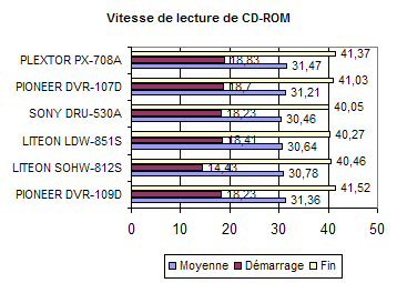 En lecture de CD-Audio, le DVR-109D démontre tout son potentiel en atteignant une vitesse maximale de 41.85x ce qui le propulse littéralement en tête de ce classement. Notons néanmoins que le SOHW-812S dispose d’une meilleure vitesse de lecture moyenne supérieure à ses concurrents..