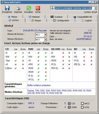 Les informations techniques Les informations suivantes sont extraites des logiciels Nero 8.2.8.0 et NeroInfoTool 5.1.0.0, disponibles tous deux dans notre section Téléchargement.