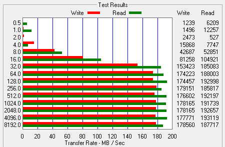 Le programme a mesuré des débits séquentiels de 192,9 Mo/s en lecture et de 179 Mo/s en écriture ce, qui est très bon et conforme (et même légèrement plus plus élévé) que ce qu’annonçait le fabricant en promettant 190 Mo/s en lecture