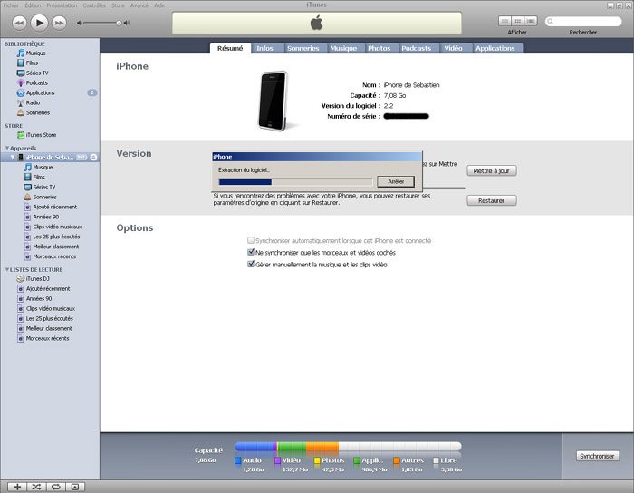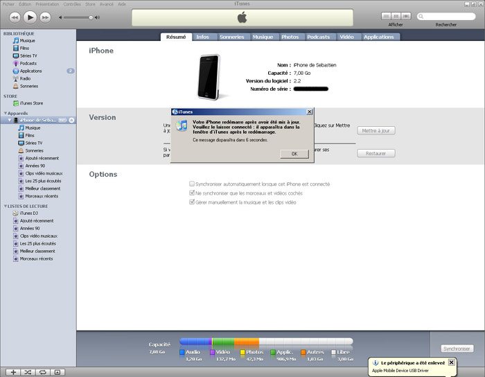 – Connectez votre iPhone au PC puis lancez iTunes (la version 8.2 c’est impératif !)