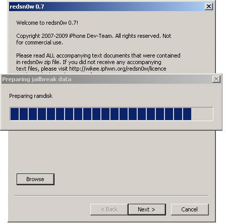 – Cliquez ensuite sur Next pour passer à l’étage suivante ; Redswn0w se charge alors de préparer le ramdisk.