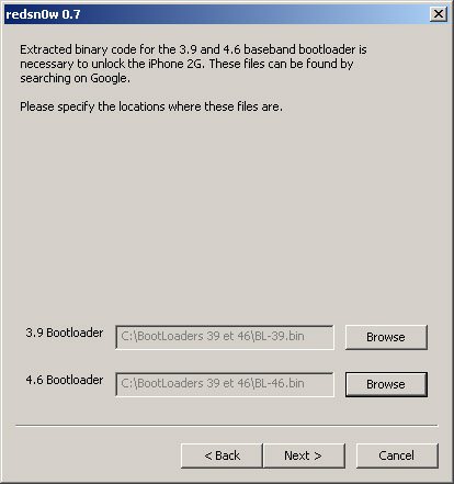 – Dans le cas d’un iPhone edge à désimlocker, il vous sera demandé de fournir les Bootladers 3.9 et 4.6 téléchargés précédemment.