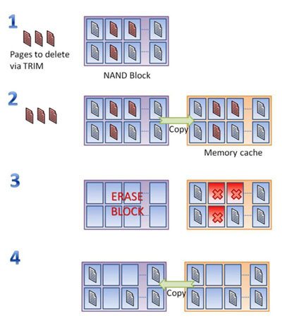 En 4 : le contrôleur ramène les pages valides, ré-agencées si nécessaire, dans le bloc de mémoire NAND. Les pages vides sont identifiées par le SSD comme immédiatement utilisables.