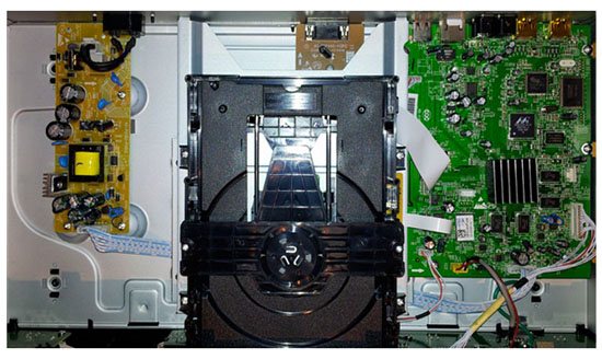 Vue de l’intérieur de la platine Pioneer : Alimentation électrique à découpage (génératrice de parasites), platine de lecture de type standard informatique, intégration maximale de composants électroniques économiques. Peu de choses distinguent la BDP-LX55, pourtant qualifiée de « haut de gamme » par Pioneer, de ses petites sœurs : une plaque de tôle pour réduire les vibrations du drive, une gestion séparée des flux vidéo et audio par HDMI. Même la façade reste en plastique. En cas de panne, une réparation est possible, mais ne sera pas viable économiquement.