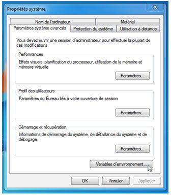 Maintenant, voyons le déplacement des dossiers TEMP et TMP. Revenez sur la fenêtre des propriétés système et cliquez sur « variables d’environnement ».
