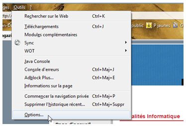 Dans le cas de FireFox, ouvrez le navigateur puis cliquez sur sur « Outils » et ensuite sur « Options ».