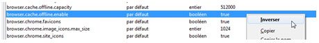 Trouvez la ligne : browser.cache.offline.enable, faites un clic droit dessus et sélectionner inverser. La valeur « True » devient « False » et le cache est désactivé. Vous pouvez fermer Firefox.