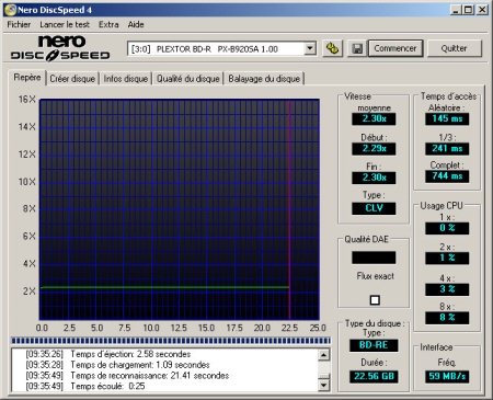 La lecture d’un BD-RE de marque IMATION contenant 22,56Go de données a démarré à la vitesse de 2,29x pour s’achever au final en 2,30x. La vitesse de lecture moyenne se situait donc à 2,30x.