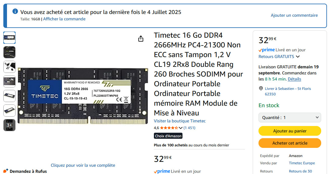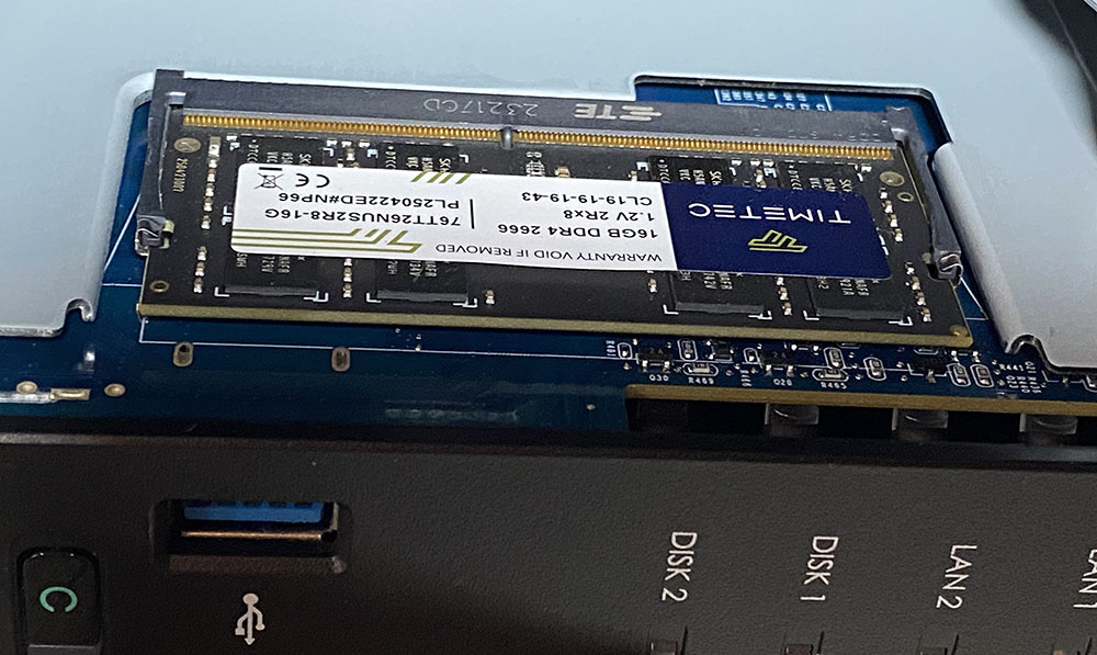 Personnellement j’ai opté pour une marque moins chère : Timetec 16 Go DDR4 2666MHz PC4-21300 Non ECC (dont le prix fluctue entre 32€ et 37€) et depuis le mois de juillet tout fonctionne comme un charme. La barrette SODIMM de 16 Go de DDR4 a été installée sans souci dans l’emplacement prévu à cet effet sur le NAS DS224+.
