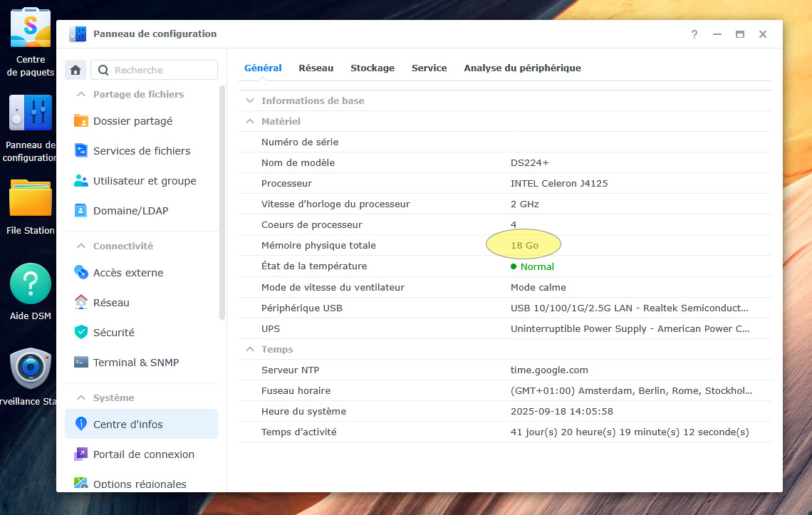 Le DS224+ dispose à présent de 18 Go de RAM (2 Go d’origine + 16 Go supplémentaire) et il a gagné encore plus en réactivité. Je vais maintenant pouvoir profiter pleinement de cette jolie quantité de mémoire en ouvrant mon NAS à d’autres fonctionnalités que je n’avais pas encore abordé sur mes NAS pour l’instant : Plex, Docker, etc..