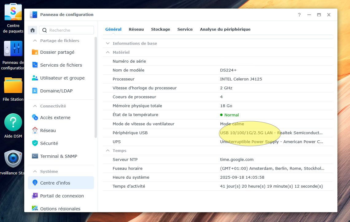 Une fois les drivrers installés, le port 2,5 Gbps est bien reconnu par DSM et par le NAS :