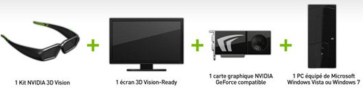 – Les lunettes à obturateur (obscure chaque œil par intermittence), comme le système 3D Vision de NVIDIA . Ces lunettes nécessitent un affichage 120Hz simple (les écrans Plasma ont un avantage sur les LCD du fait de leur vitesse, on peut trouver aussi des premiers projecteurs 120Hz 720p à moins de 600 euros, comme le ACER H5360 ; voir liste de projecteurs ici) et un émetteur pour la synchronisation en l’affichage et les lunettes. Comme défauts, outre le coût des lunettes et de leur grosseur, la luminosité doit être augmentée comme pour les lunettes passives, voire plus (du fait de l’assombrissement des lunettes).