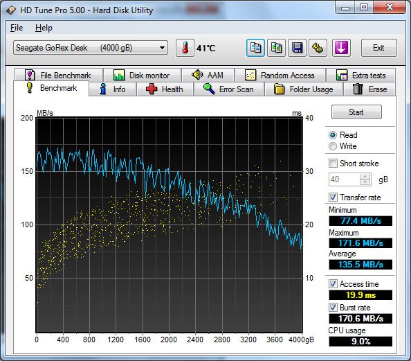 Comme on peut le remarquer une fois encore, les débits en lecture proposés par le GoFlex Desk de 4 To sont très bons puisque HD Tune Pro nous confirme les performances annoncées par CrystalDiskMark en nous indiquant un débit de 171,6 Mo/s en lecture. Un chiffre qui correspond au débit maximum qui a pu être atteint lors du test. En moyenne, d’après HD Tune Pro il faudra plutôt miser sur 135,5 Mo/s ce qui reste de toute façon encore très bon pour un HDD externe.