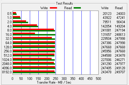 Le deuxième programme, ATTO, permet de mesurer plus en détails les taux de transferts du disque en procédant par palier. Comme on peut le voir sur l’image ci-dessous, les résultats obtenus avec l’IronWolf Pro sont encore très bons puisque le logiciel mentionne des débits maximum de 249,7 Mo/s en lecture et de 247,4 Mo/s en écriture. Pour les débits minimum avec des petits fichiers on tourne à 24 Mo/s en lecture et de 20,1 Mo/s en écriture.