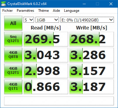 Avec le programme ATTO on a également pu mesurer de très bons débits. En effet, le bench mentionne des débits maximum de 268,9 Mo/s en lecture et de 267,8 Mo/s en écriture. Pour les débits minimum avec des petits fichiers il était question de 25 Mo/s en lecture et 16 Mo/s en écriture.