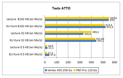 Nous sommes ensuite passé sous ATTO 2.47 afin de poursuivre notre série de benchmarks. Cette fois, le logiciel nous a indiqué un débit maximum de 550 Mo/s en lecture et un débit de 522,5 Mo/s en écriture.