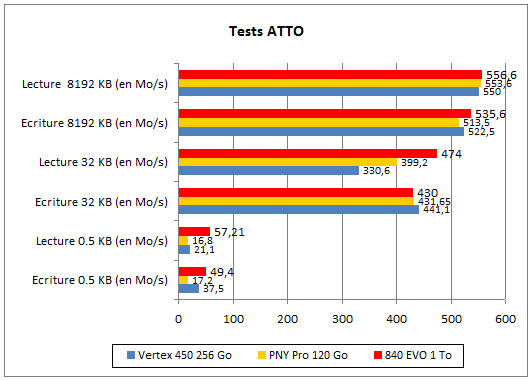 Passons ensuite au programme ATTO pour mesurer une nouvelle fois les débits du disque. Le benchmark affiche cette fois des résultats qui tiennent dans un mouchoir de poche surtout avec les gros fichiers. En effet, ATTO mentionne un débit de 556,6 Mo/s en lecture et un débit de 535,6 Mo/s en écriture pour le 840 EVO alors que les SSD concurrents atteignaient respectivement 550 / 553,6 Mo/s en lecture et 522,5 / 513,5 Mo/s en écriture lors du traitement des mêmes fichiers. Des différences pour le moins minimes… Mais comme on peut également le voir l’écart tend à se creuser lorsque l’on travaille sur de petits fichiers. Là le Samsung 840 EVO de 1 To reprend du poil de la bête et atteint les 57,21 Mo/s en lecture et 49,4 Mo/s en écriture sur les fichiers de 0,5 Kb.