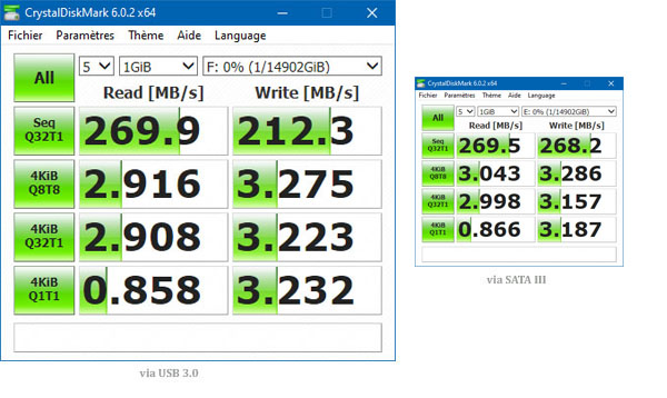 Pour les besoins de ce test, j’ai utilisé le plus gros modèle que j’avais à disposition. C’est donc le Seagate IronWolf de 16 To qui a servi à passer en revue et à bencher le DS200U3. Et pour voir ce que ça donne, on peut s’amuser à comparer les performances de l’IronWolf 16 To obtenues en USB 3.0 via le DS200U3 à celles à qu’il propose habituellement en SATA III et les résultats sont plutôt bons comme on va le voir ci-dessous.