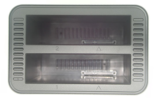 Sous le couvercle, les deux baies sont numérotées (« 1 » et « 2 ») ce qui permet de les identifier visuellement grâce aux LEDs présentes en façade. Chaque baie peut accueillir un disque au format 3,5 pouces doté d’une connectique SATA (I, II ou III).