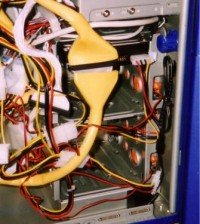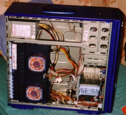 Comme vous pouvez le constater, bien qu’aucun composant de ne soit pour l’instant installé, le boîtier regorge de fils en tous genres. Relativisons tout de même : l’alimentation Enermax 350 W utilisée pour ce test était très fournie en fils, on remarquera d’ailleurs les fils « tuyau de douche » de cette alimentation, qui pourraient ne pas être du goût de tout le monde…