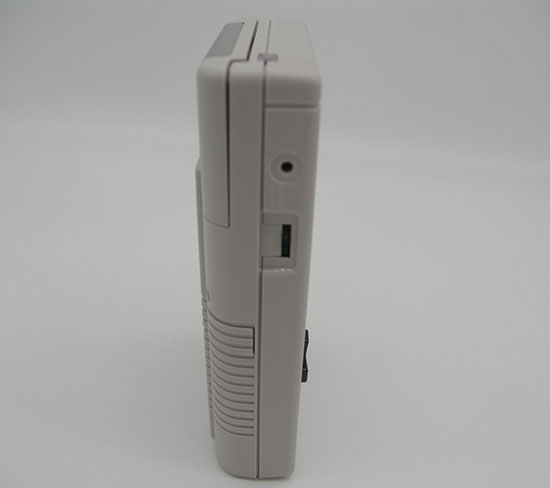 Sur la gauche, on découvre ce qui s’apparente à une entrée de prise jack mais en fait non ! C’est ici dans cet emplacement que l’on vient brancher le câble d’alimentation qui revêt une forme un peu bizarre (style jack donc..) Rassurez-vous si le câble a ce type de connecteur d’un côté ; de l’autre côté on trouve un connecteur usb tout ce qu’il y a de plus classique et l’on pourra donc brancher le câble à un chargeur usb, une batterie externe, un PC, ou ce que vous voulez. Le tout étant que le matériel choisi soit capable de délivrer les 5 Volts requis pour alimenter le GPI Case. Sous la prise d’alimentation, on trouve une molette qui permet cette fois de changer le contraste de l’écran.