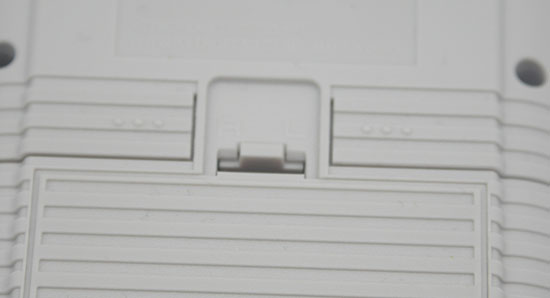Toujours à l’arrière mais un peu plus bas, on peut apercevoir les boutons L et R. Oui oui regardez bien !! Ils sont là juste au dessus de l’emplacement pour les piles.
